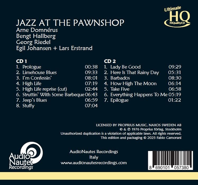 Jazz at the Pawnshop is widely regarded as a reference recording, one of the most natural-sounding live jazz reproductions of all time. This is a historically significant album. This is a special deluxe double-disc rendition of one of the most famous audiophile cult recordings. Jazz at the Pawnshop is a multi-session recording made by Swedish sound engineer Gert Palmcrantz on December 6-7, 1976, at Jazzpuben Stampen (Pawnshop) in Stockholm, Sweden. A pawnshop had operated on the site prior to the jazz club. Proprius Records founder Jacob Boethius produced the album, and it has been issued several times under multiple labels and formats.