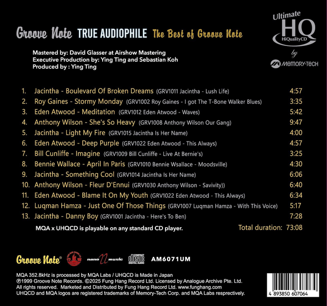 This is Groove Note's first audiophile "Best Of" collection and now available on Silver-Alloy UHQCD with Hi-Rez MQA 352.8kHz encoding. This MQA and UHQCD is playable on any regular CD player. When paired with MQA-decoder, it unveils the full master quality, high resolution recording.