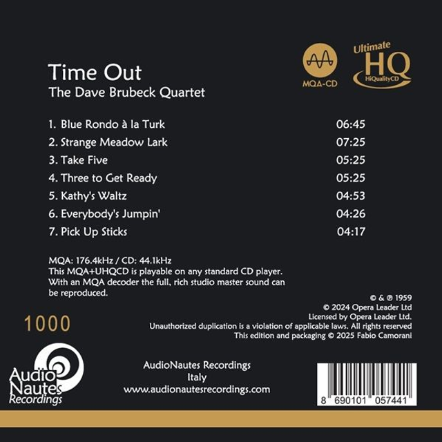 Time Out for the first time in UHQCDs, directly mastering from the original master tapes. No Compromise Music Reissues - AudioNautes Recordings started with the purpose of offering the very best version of some favourite (sometimes almost unknown or forgotten) recordings.